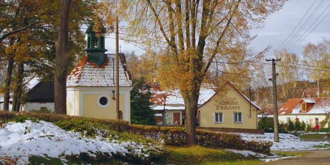 Kaple na návsi z roku 1861 opatřená zvoničkou se zvonem